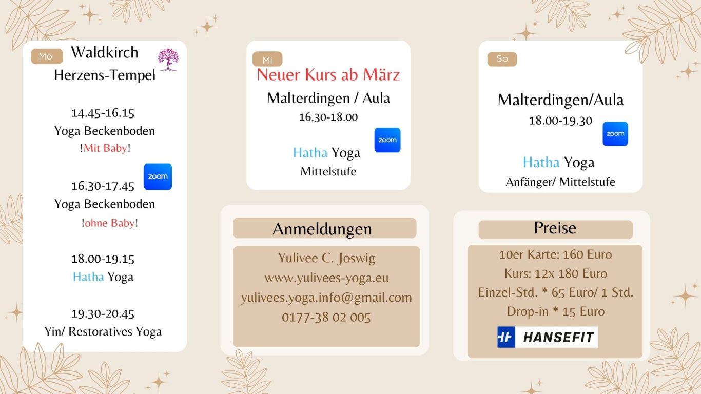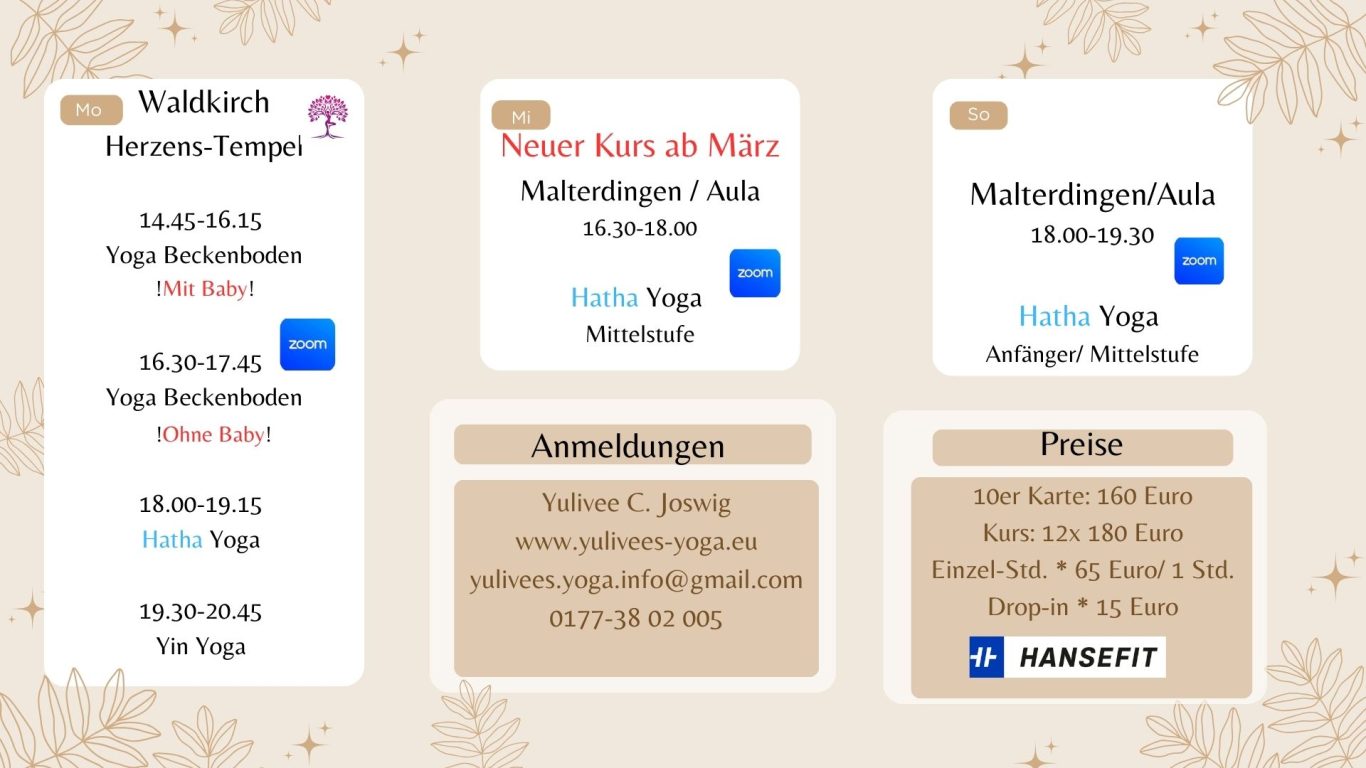 Ob du einen yogatherapeutischen Einzelunterricht in Anspruch nehmen oder einfach dein persönliches Übungsprogramm geplant haben und darin begleitet werden möchtest - Yoga fördert deine individudelle Gesundheit, deine Beweglichkeit und dein mentales Wohlbefinden.